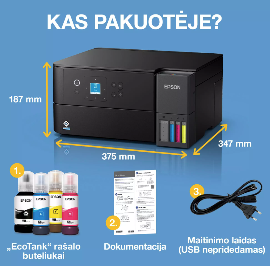 - Mobiliojo spausdinimo galimybė: Apple AirPrint, Epson Smart Panel App, Epson Connect (Email Print, Remote Print Driver)