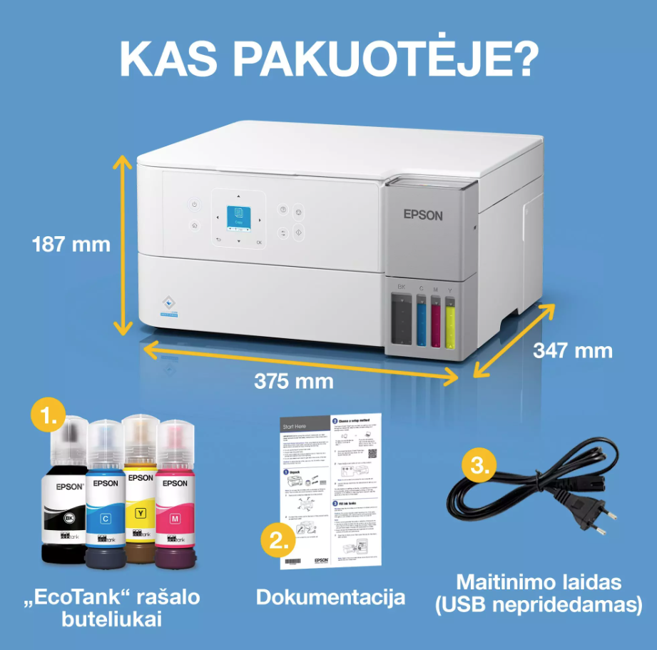 - Mobiliojo spausdinimo galimybė: Apple AirPrint, Epson Smart Panel App, Epson Connect (Email Print, Remote Print Driver)